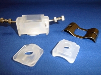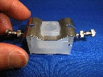 In-Line Cells come completely assembled and ready to use except for sterilizing. After use, it is recommended that they be disassembled and cleaned. They are re-assembled as follows: The body of the cell is held upside-down and the glass or polycarbonate viewing window is placed onto the sealing surface of the receptor compartment. The window locknut is screwed in snugly against the viewing window, overly tightening this locknut is not necessary. The cell is placed on a horizontal surface and each of the adjusting screw and pressure setting nut assemblies are replaced with the cotter pins that allow them to swivel in and out of the slots in the stainless steel spring. The membrane to be used is placed inside the cell over the orifice which is the top of the receptor compartment. The donor compartment is lowered down within its mating cavity until it rests on top of the membrane. The stainless steel clamping spring is lowered over the donor compartment onto the clamping surface. The adjusting screw assemblies are swiveled into place in the slots of the spring and the pressure setting and locking nuts are adjusted to the desired pressure. Connectors are installed with tubing into the 1/4-28 HPLC inlet and outlet ports and the cell is placed in a Cell Warmer or Twin-Flow Conversion System to be brought up to temperature |