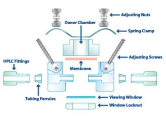 PermeGear In-Line Cells may be thought of as a flow type Franz Cell with a very small receptor volume. In-Line Cells locate the membrane of interest in the horizontal plane and have donor chambers open to the air although occluded donor chambers are available.In-Line Cells are flow cells available in orifice diameters from 5mm to 15mm which were designed to replace the Bronaugh Cell. They are made from the plastic Kel-F which is the 3M product or Neoflon which is the Daikin product. (This material can be purchased from the Plastic Profiles division of Central Plastics.) In-Line Cells have a unique clamping system which features user preset, repeatable, secure clamping of tissue or membranes. Clamping is achieved with a stainless steel spring that applies pressure preset by the user to the upper surface of the donor compartment for leakproof clamping. The cell design locates the orifice diameters within .1mm of each other. HPLC connectors are used to connect the cells to 1/16 ID tubing. Stirring effects within the cells are easily checked with our unique Twin-Flow Conversion System.